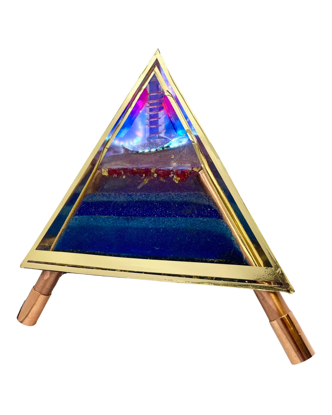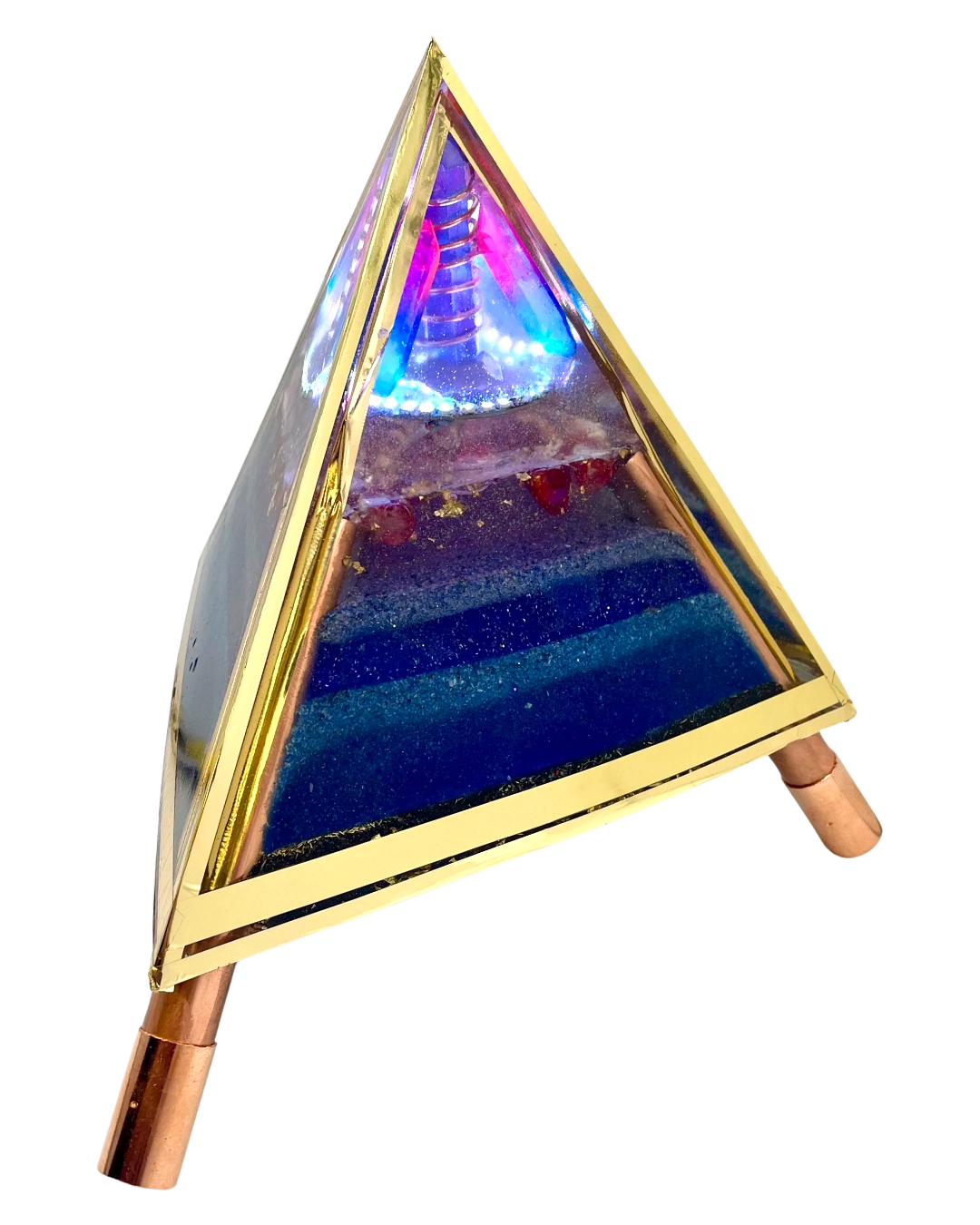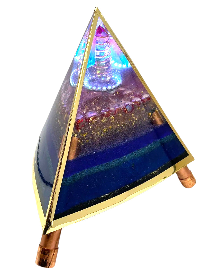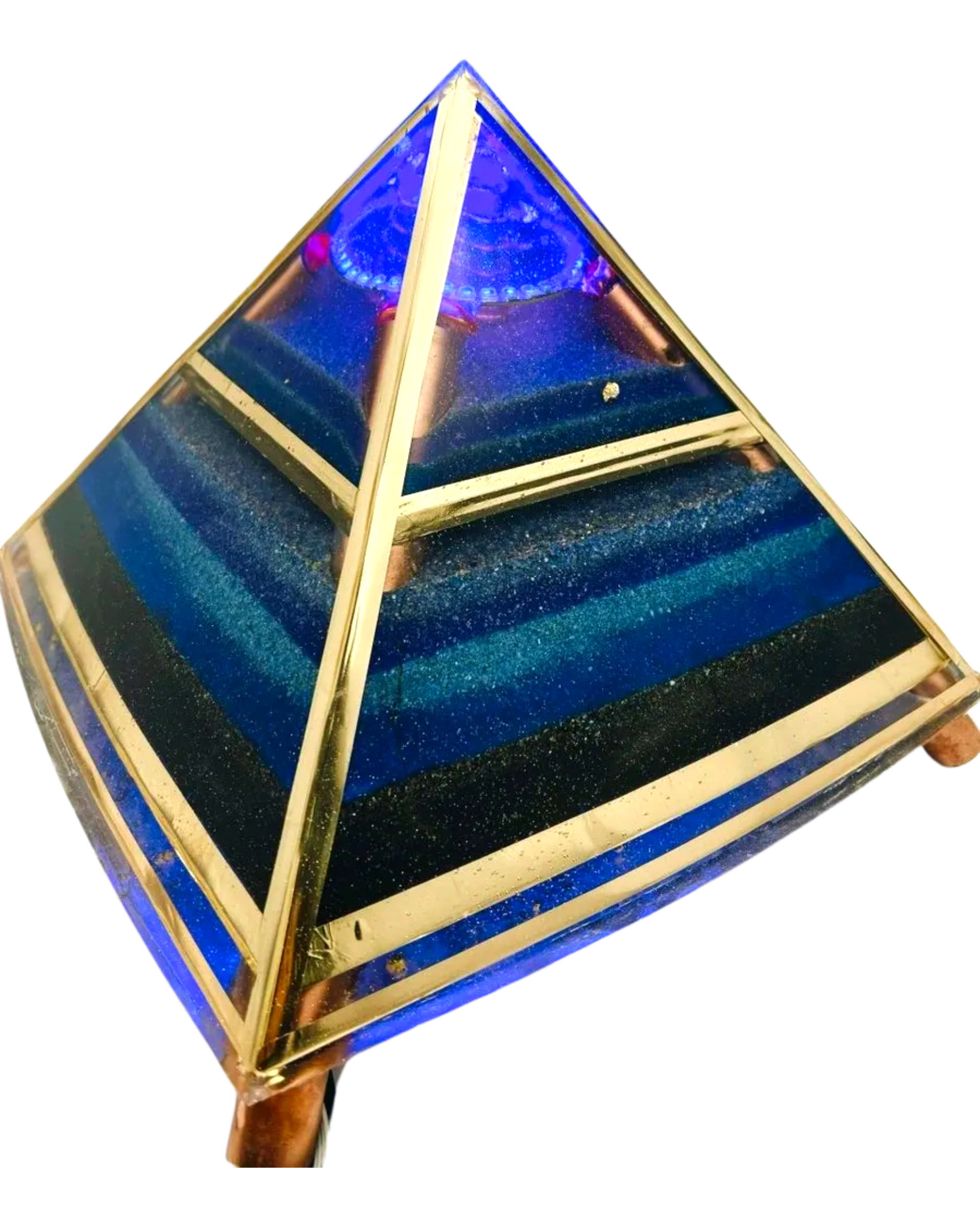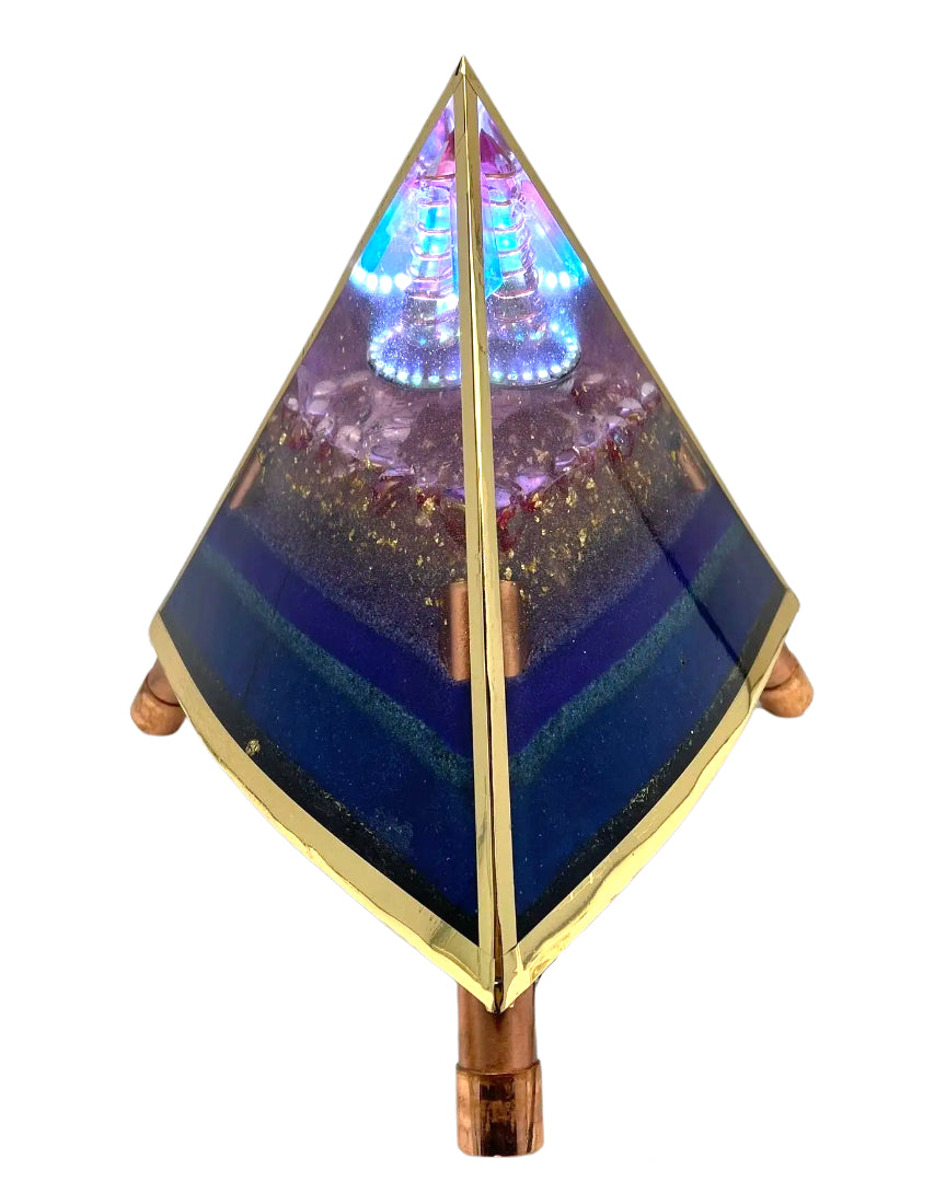 This Capstone is a "2 for 1" design as it literally consists of a Nubian Pyramid within another Nubian Pyramid. At its peak, you’ll find a 7 inch Double Terminated Brazilian Vogel wound in Copper Coil. The Crystal Vogel then connects to a 12-Sided Wire Wrapped Star Tetrahedron running clockwise and counterclockwise, which electrifies the properties of the Crystal. This generates a precision-like toroidal field, constantly elevating and cleansing the harmonic frequency of its location. This Plasma Core Generates its own Energetic Field similar to the Keshe Engine. The abundance of Plasma emitting from the device supports the body in healing itself.