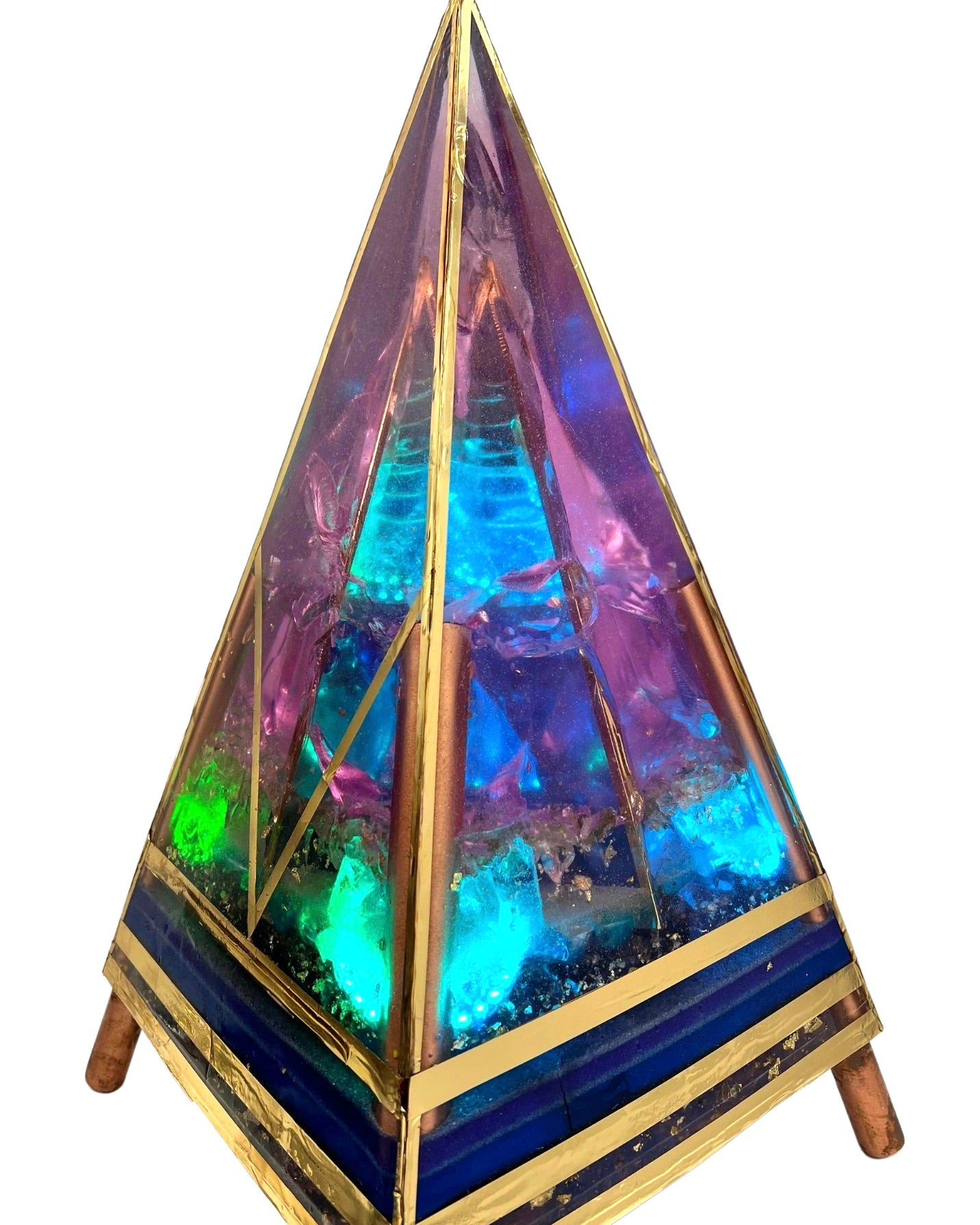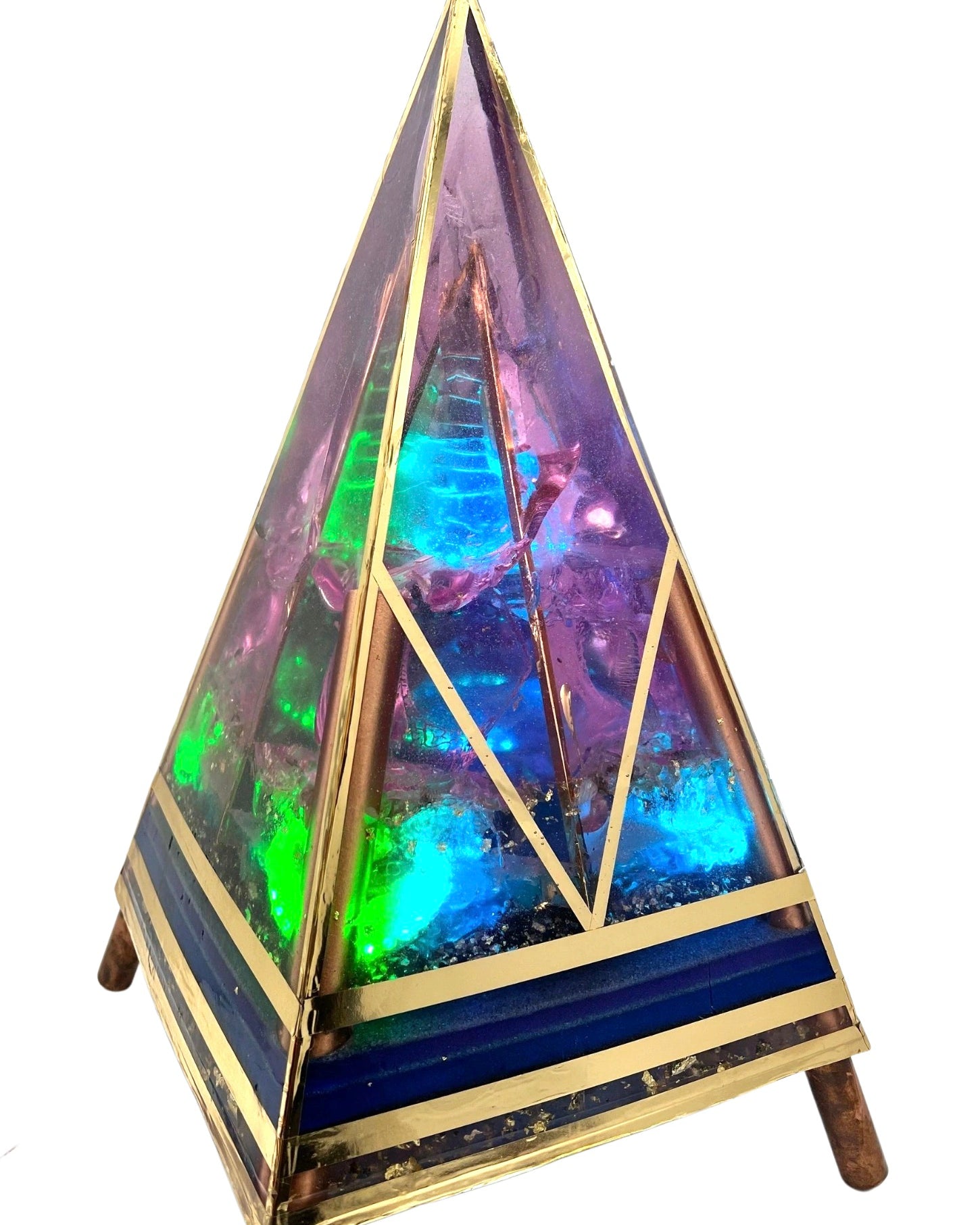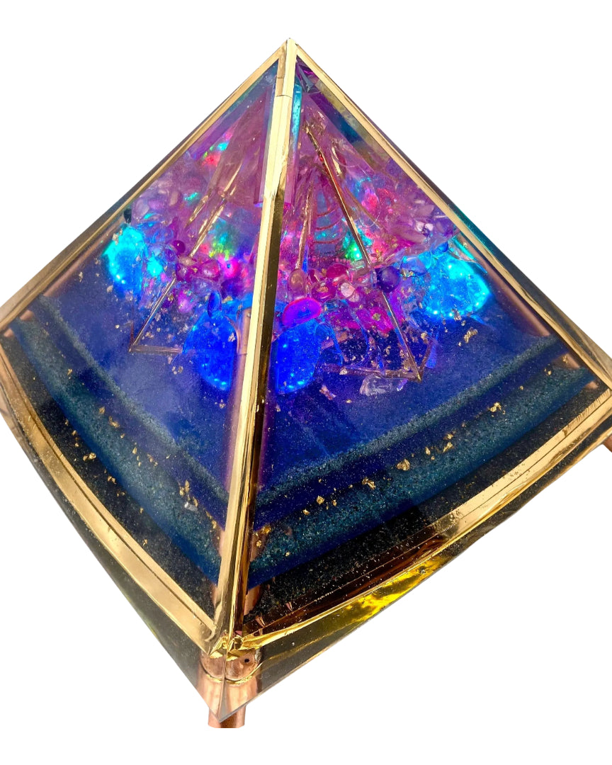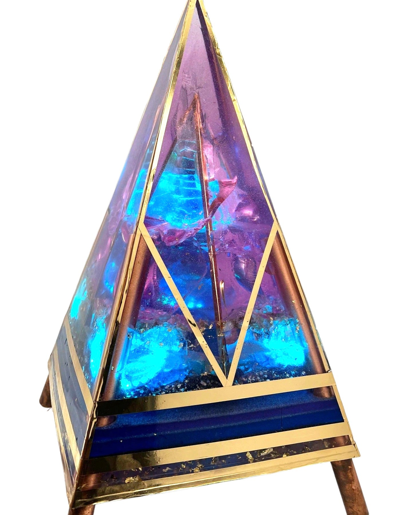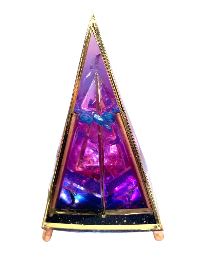 This Capstone is a "2 for 1" design as it literally consists of a Nubian Pyramid within another Nubian Pyramid. At its peak, you’ll find a 7 inch Double Terminated Brazilian Vogel wound in Copper Coil. The Crystal Vogel then connects to a 12-Sided Wire Wrapped Star Tetrahedron running clockwise and counterclockwise, which electrifies the properties of the Crystal. This generates a precision-like toroidal field, constantly elevating and cleansing the harmonic frequency of its location. This Plasma Core Generates its own Energetic Field similar to the Keshe Engine. The abundance of Plasma emitting from the device supports the body in healing itself.