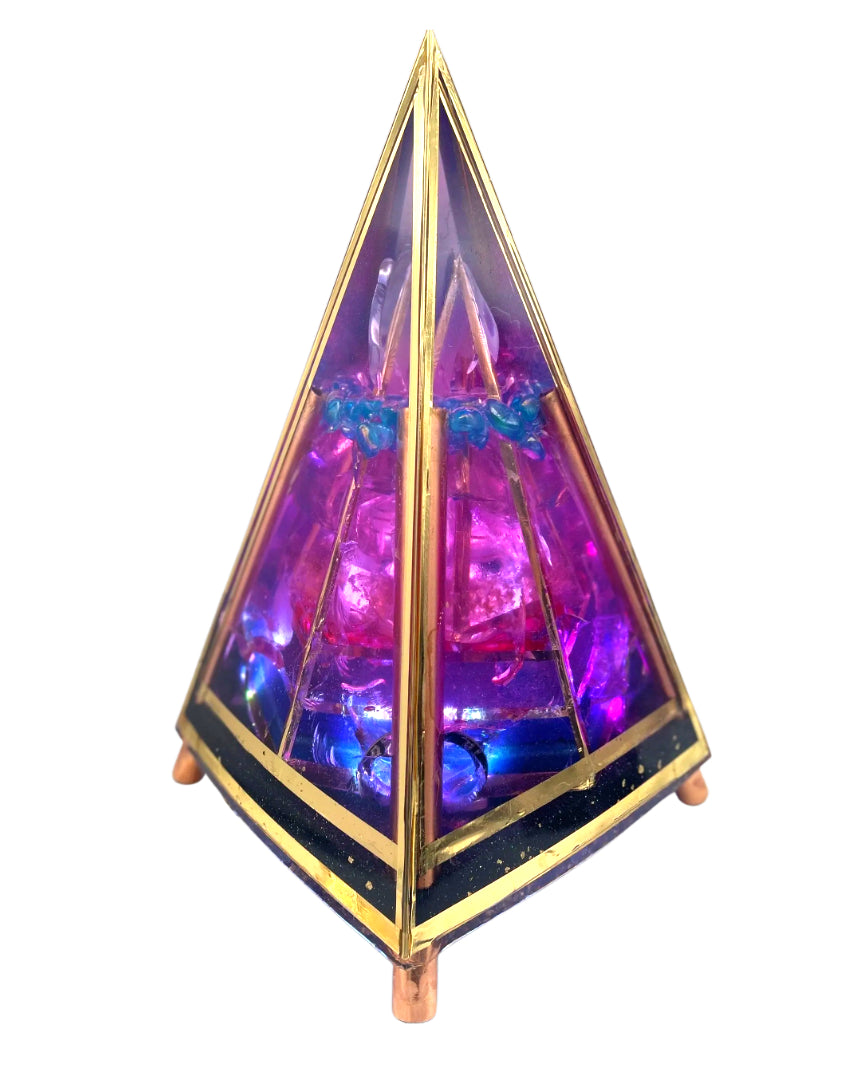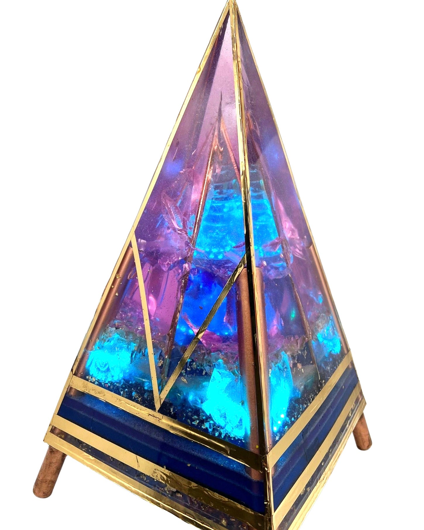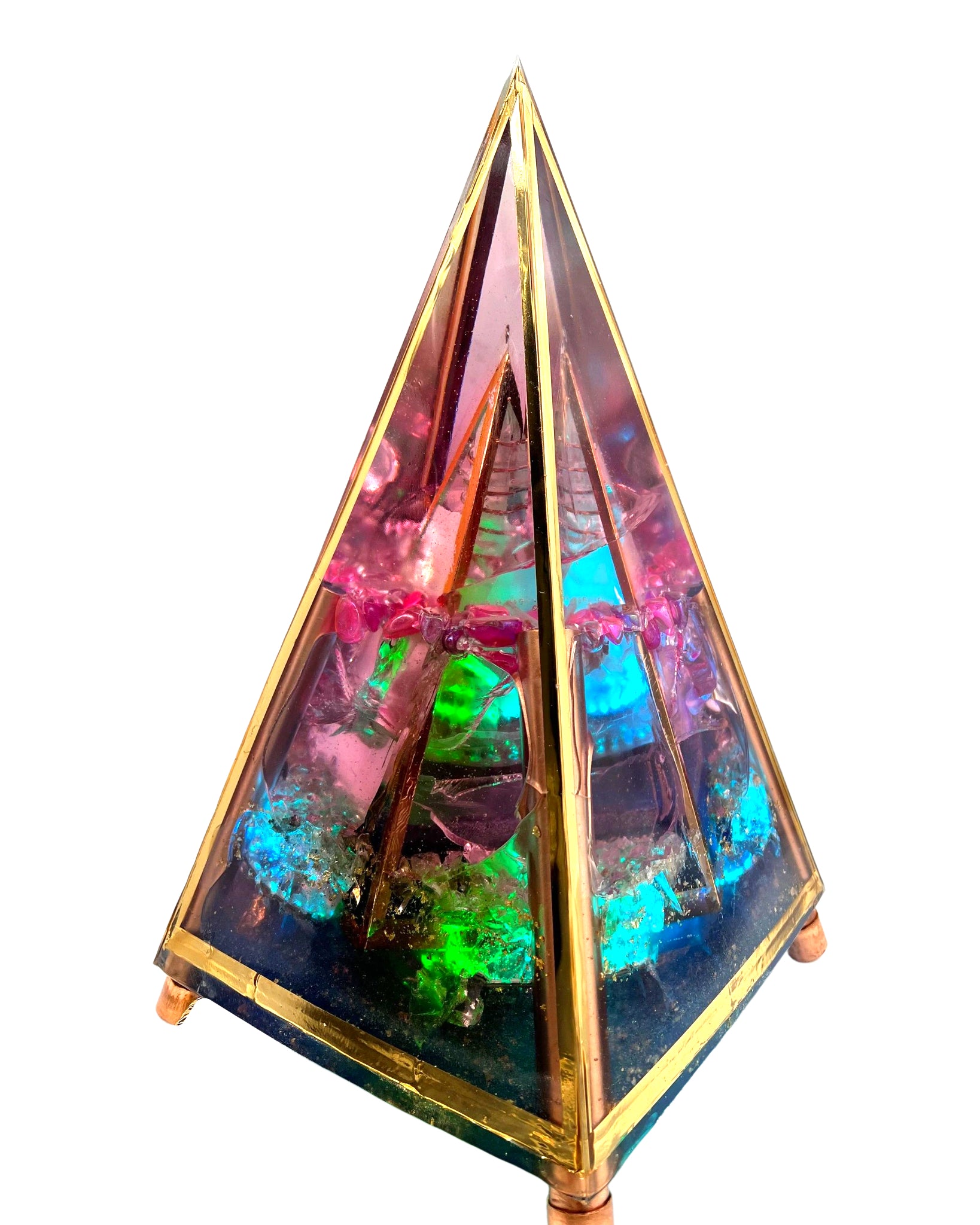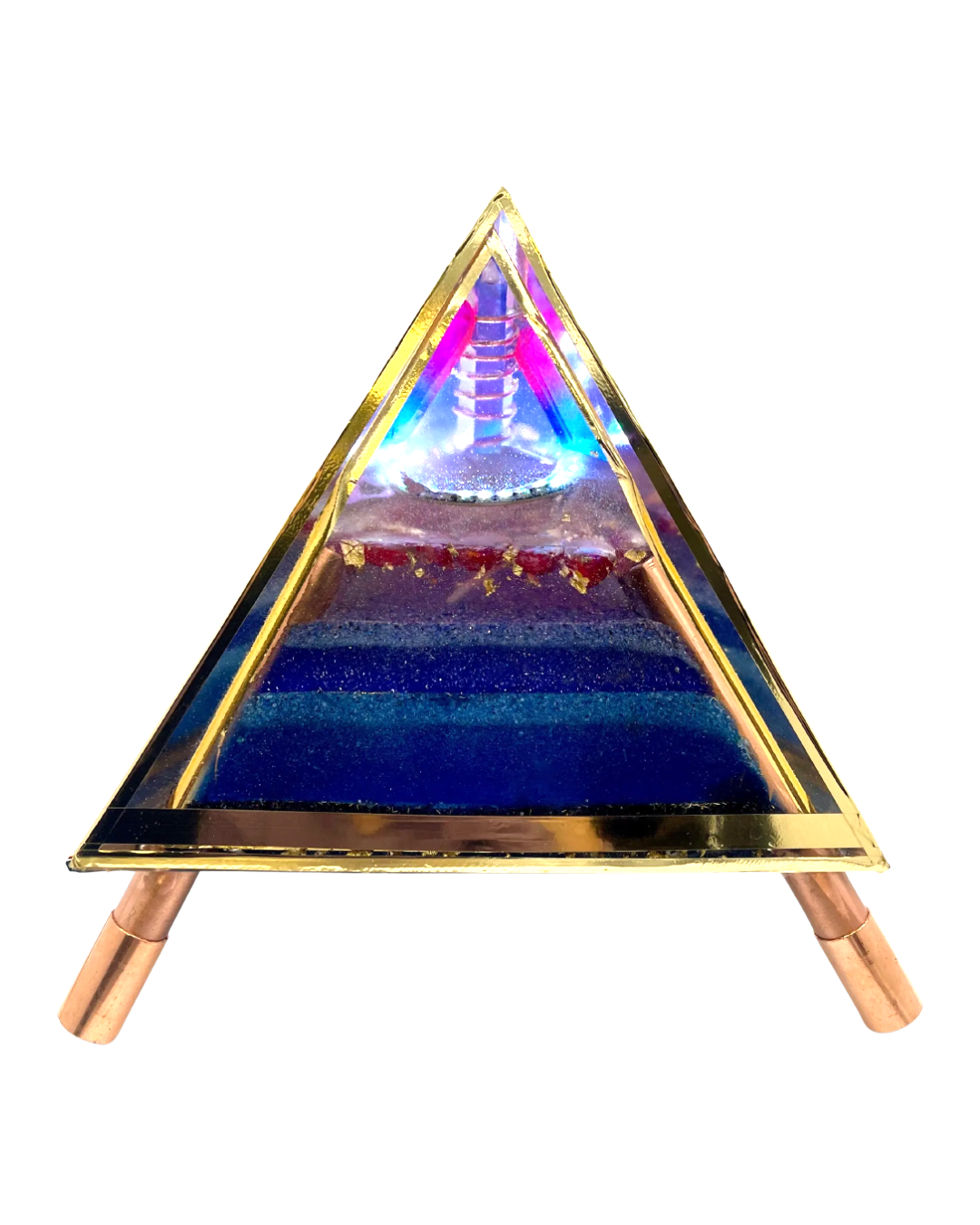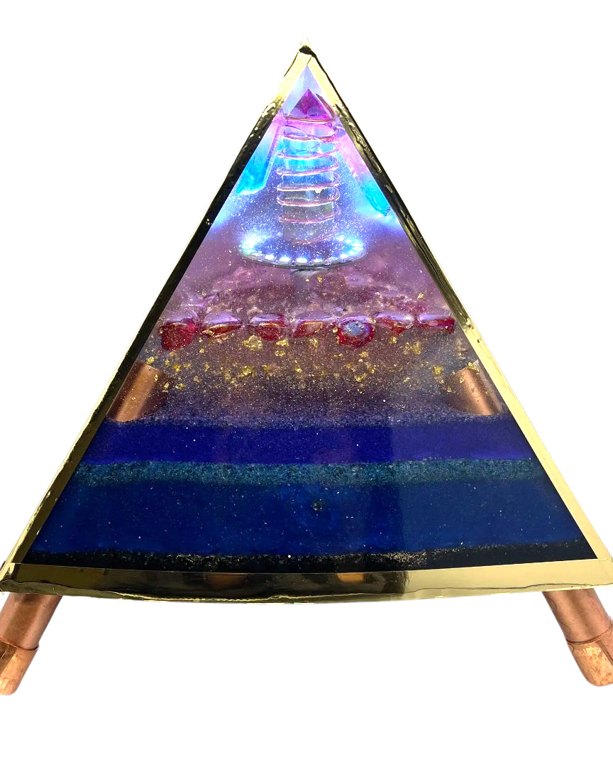 This Capstone is a "2 for 1" design as it literally consists of a Nubian Pyramid within another Nubian Pyramid. At its peak, you’ll find a 7 inch Double Terminated Brazilian Vogel wound in Copper Coil. The Crystal Vogel then connects to a 12-Sided Wire Wrapped Star Tetrahedron running clockwise and counterclockwise, which electrifies the properties of the Crystal. This generates a precision-like toroidal field, constantly elevating and cleansing the harmonic frequency of its location. This Plasma Core Generates its own Energetic Field similar to the Keshe Engine. The abundance of Plasma emitting from the device supports the body in healing itself.