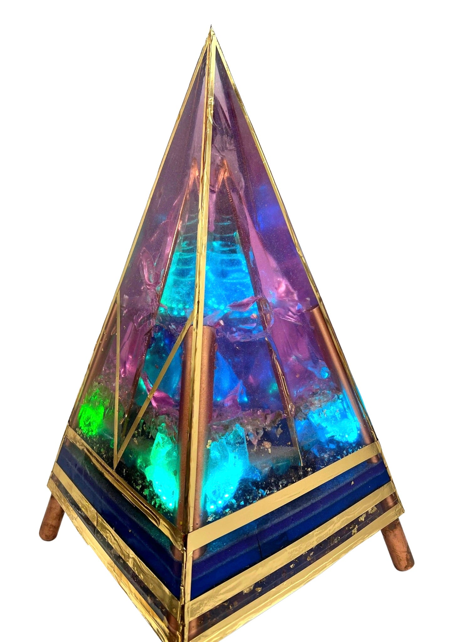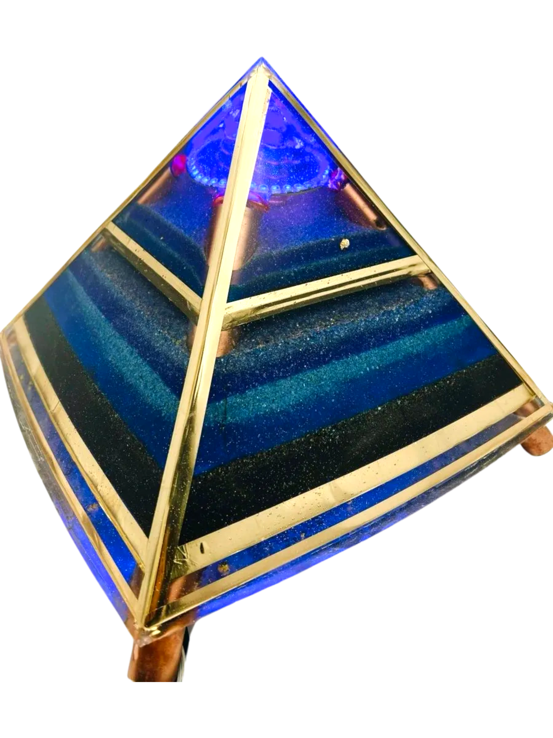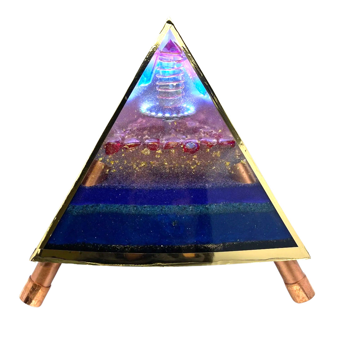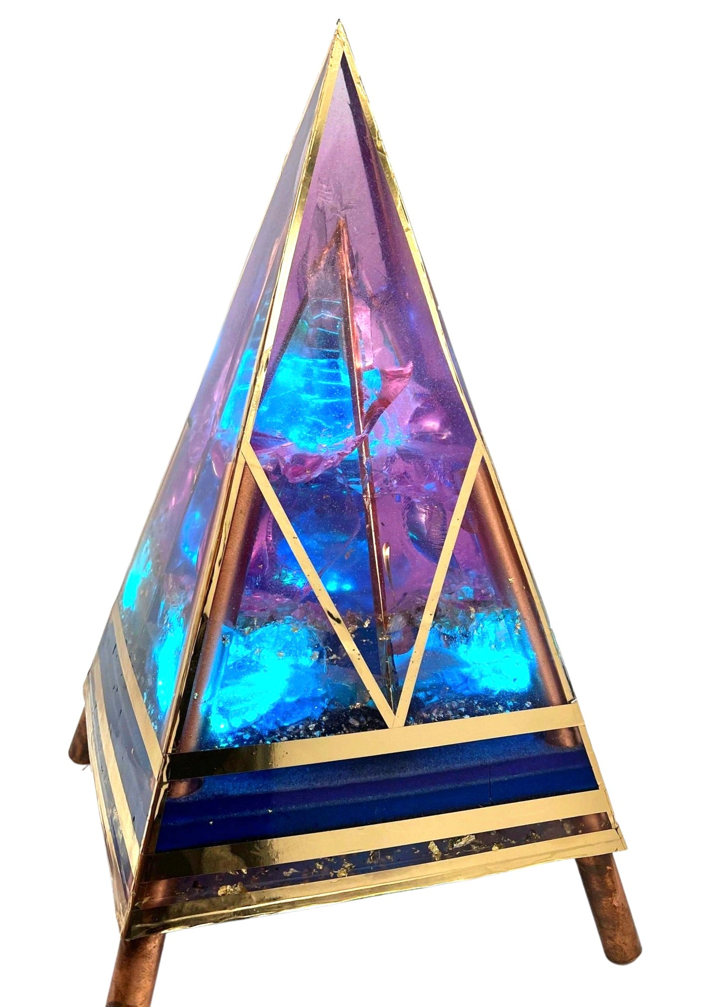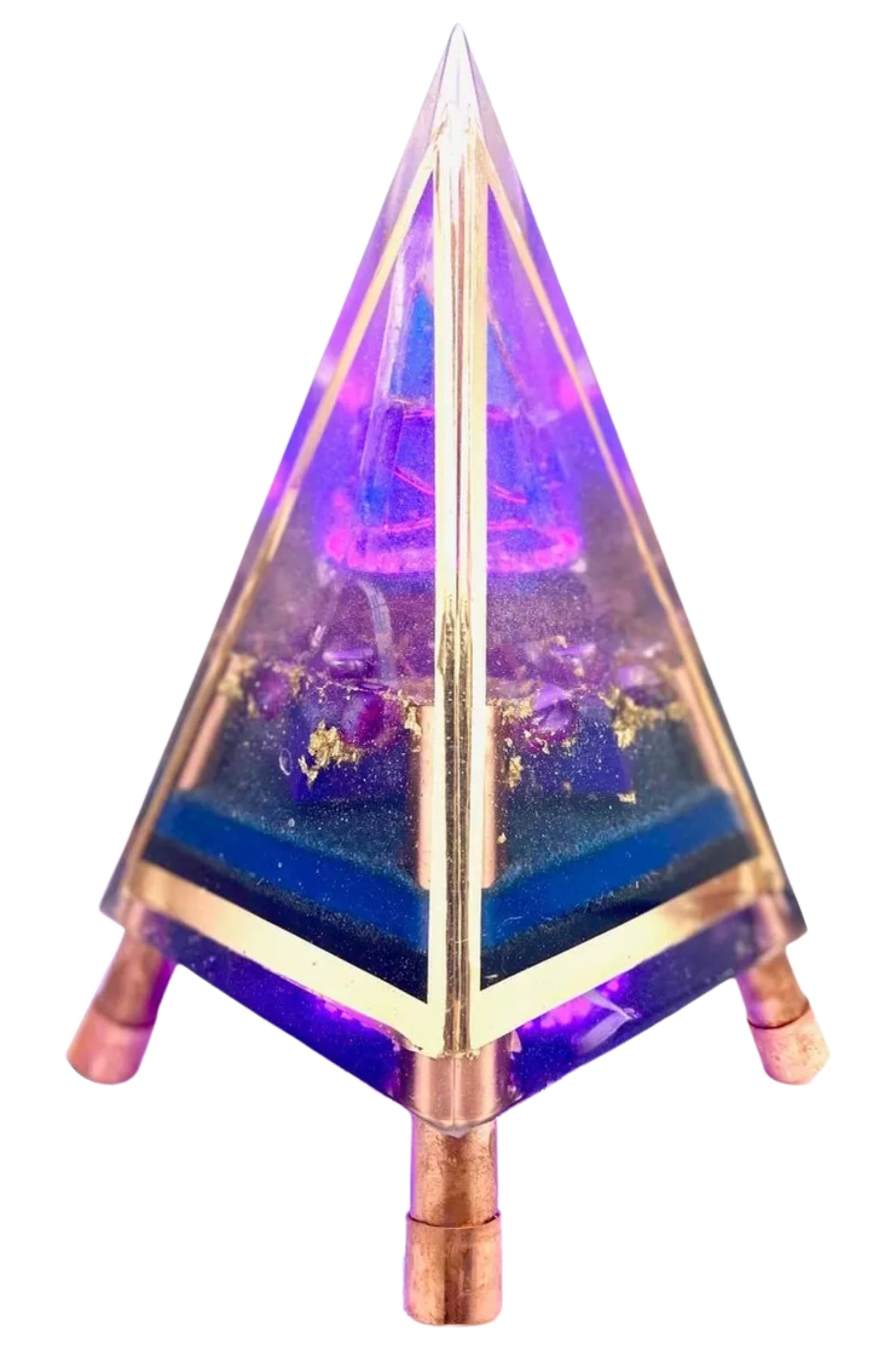 This Capstone is a "2 for 1" design as it literally consists of a Nubian Pyramid within another Nubian Pyramid. At its peak, you’ll find a 7 inch Double Terminated Brazilian Vogel wound in Copper Coil. The Crystal Vogel then connects to a 12-Sided Wire Wrapped Star Tetrahedron running clockwise and counterclockwise, which electrifies the properties of the Crystal. This generates a precision-like toroidal field, constantly elevating and cleansing the harmonic frequency of its location. This Plasma Core Generates its own Energetic Field similar to the Keshe Engine. The abundance of Plasma emitting from the device supports the body in healing itself.