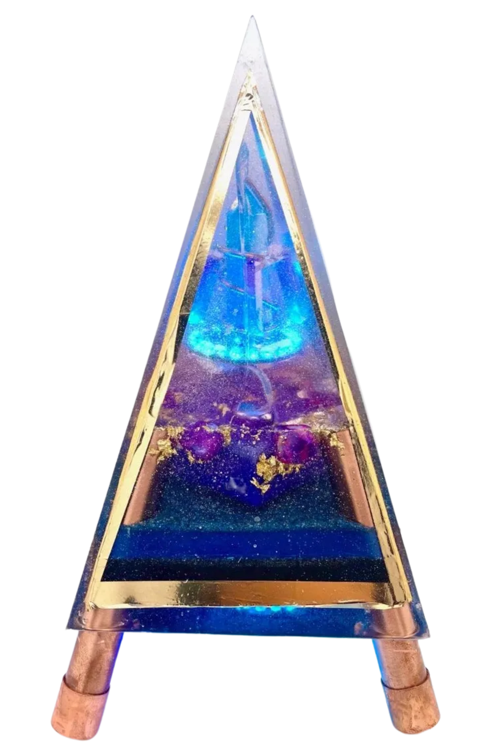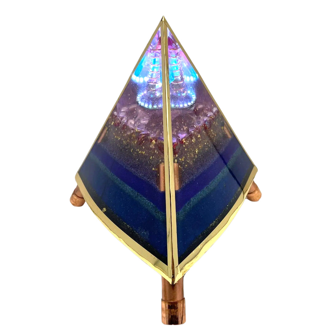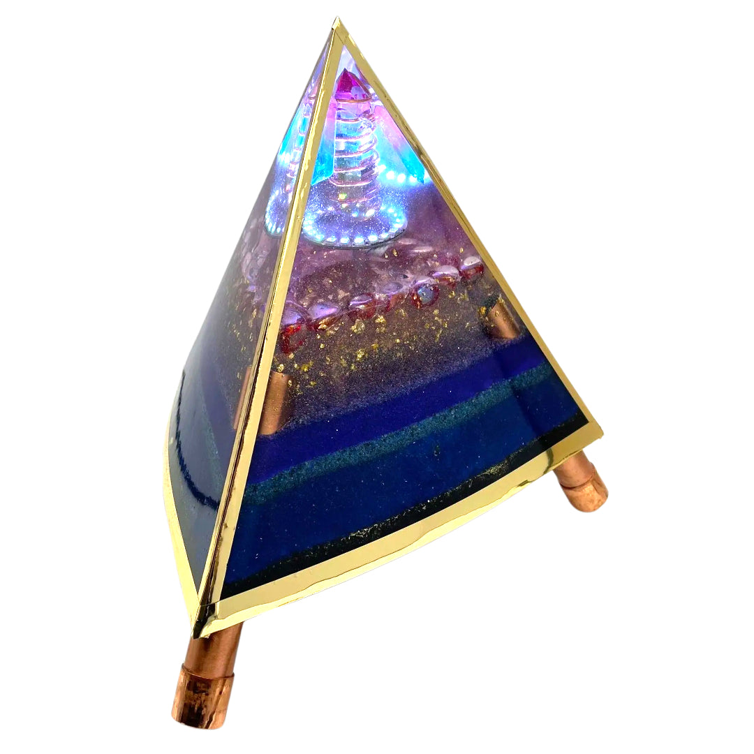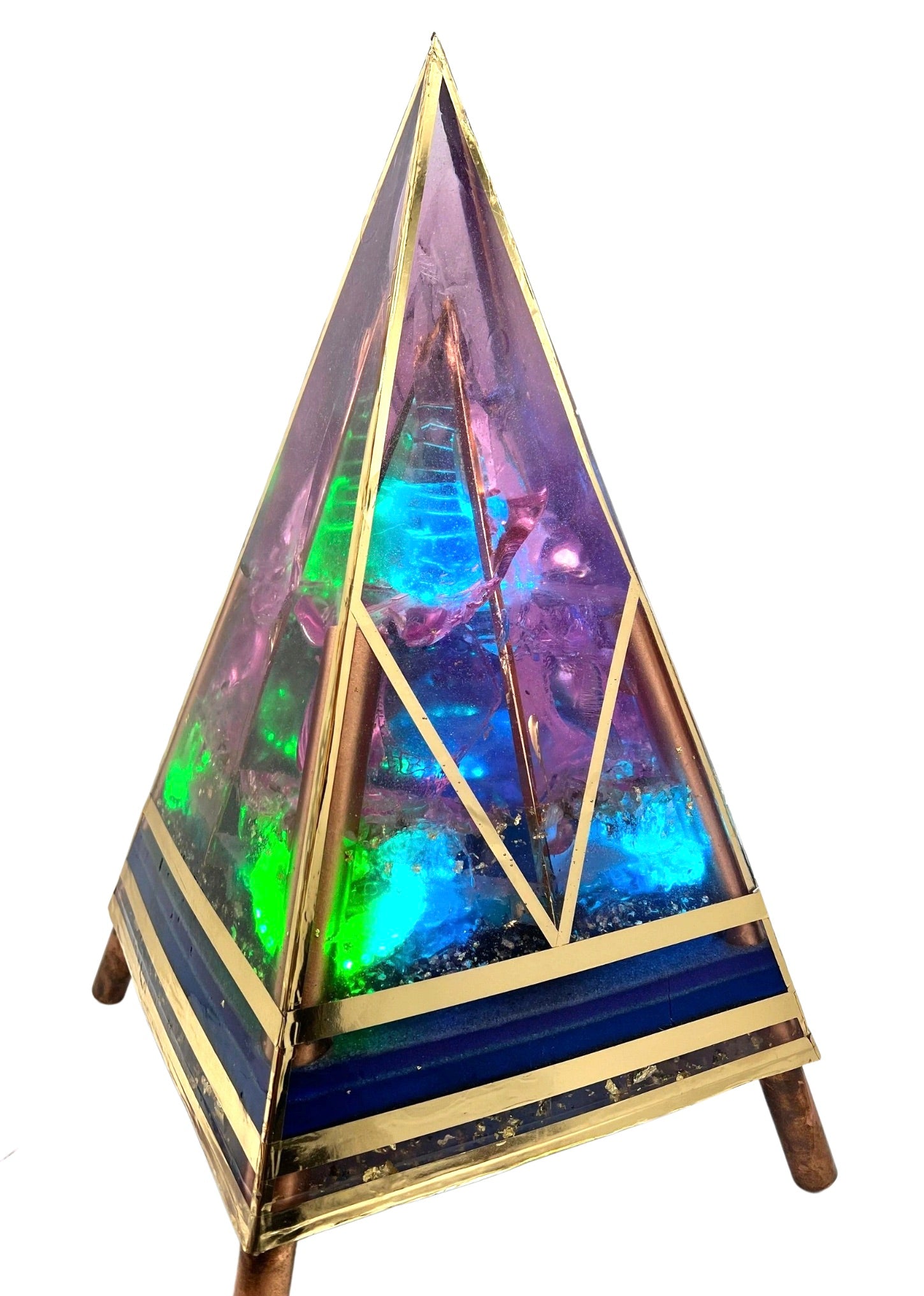 This Capstone is a "2 for 1" design as it literally consists of a Nubian Pyramid within another Nubian Pyramid. At its peak, you’ll find a 7 inch Double Terminated Brazilian Vogel wound in Copper Coil. The Crystal Vogel then connects to a 12-Sided Wire Wrapped Star Tetrahedron running clockwise and counterclockwise, which electrifies the properties of the Crystal. This generates a precision-like toroidal field, constantly elevating and cleansing the harmonic frequency of its location. This Plasma Core Generates its own Energetic Field similar to the Keshe Engine. The abundance of Plasma emitting from the device supports the body in healing itself.
