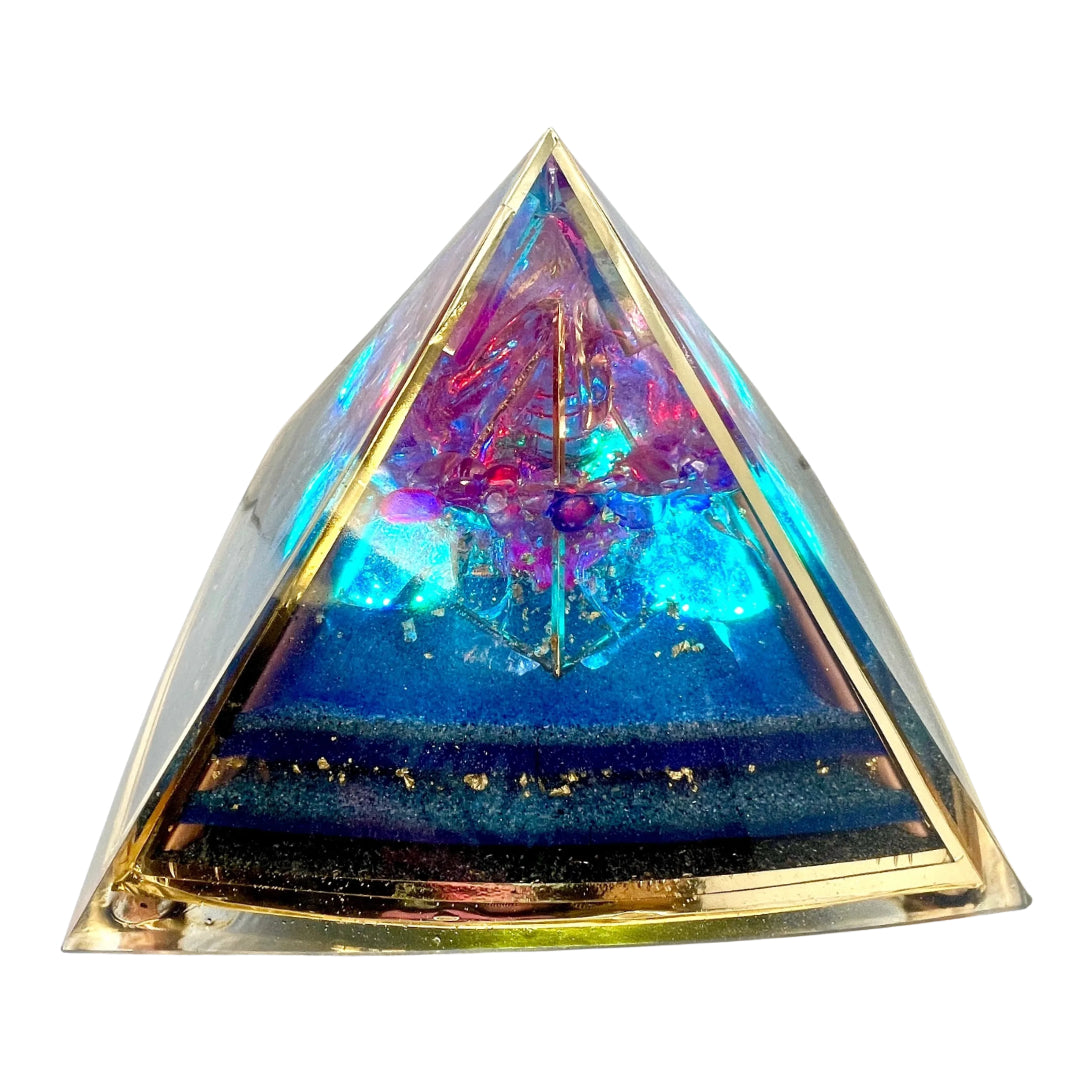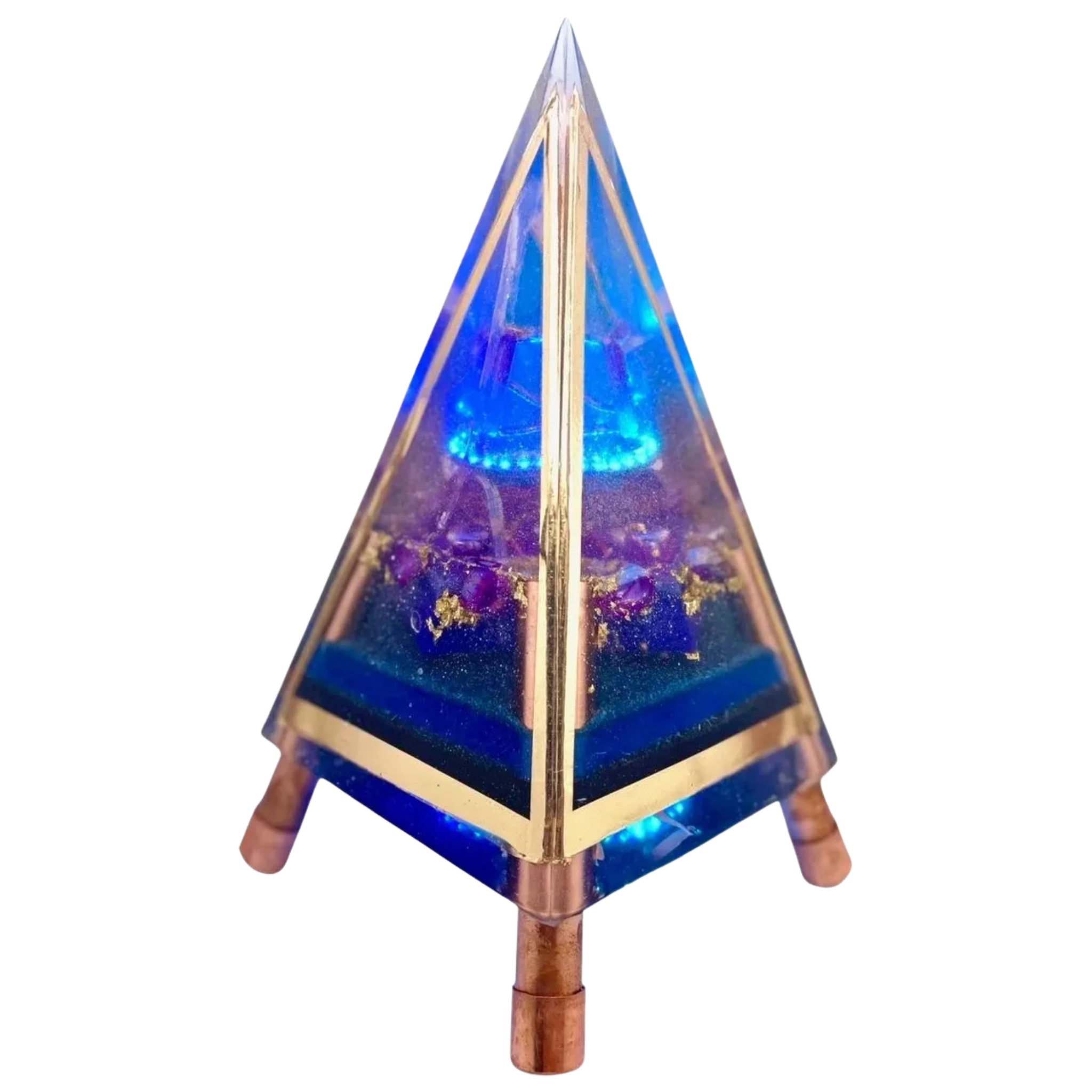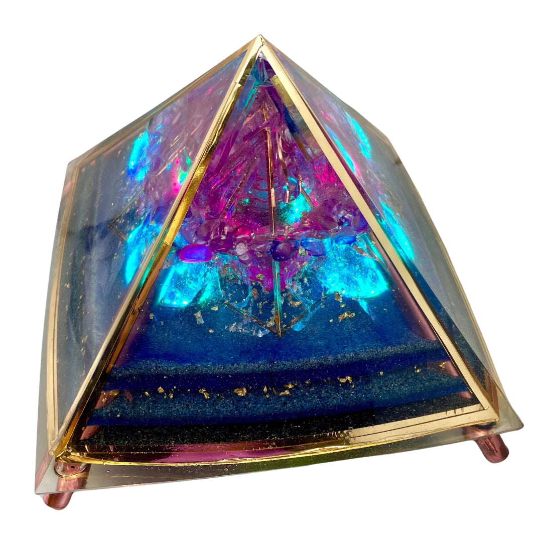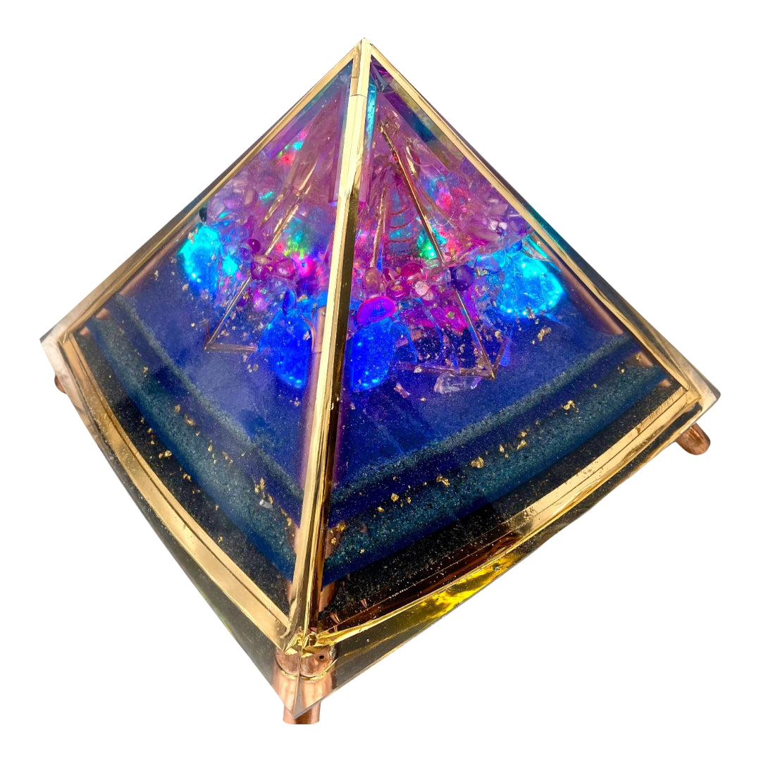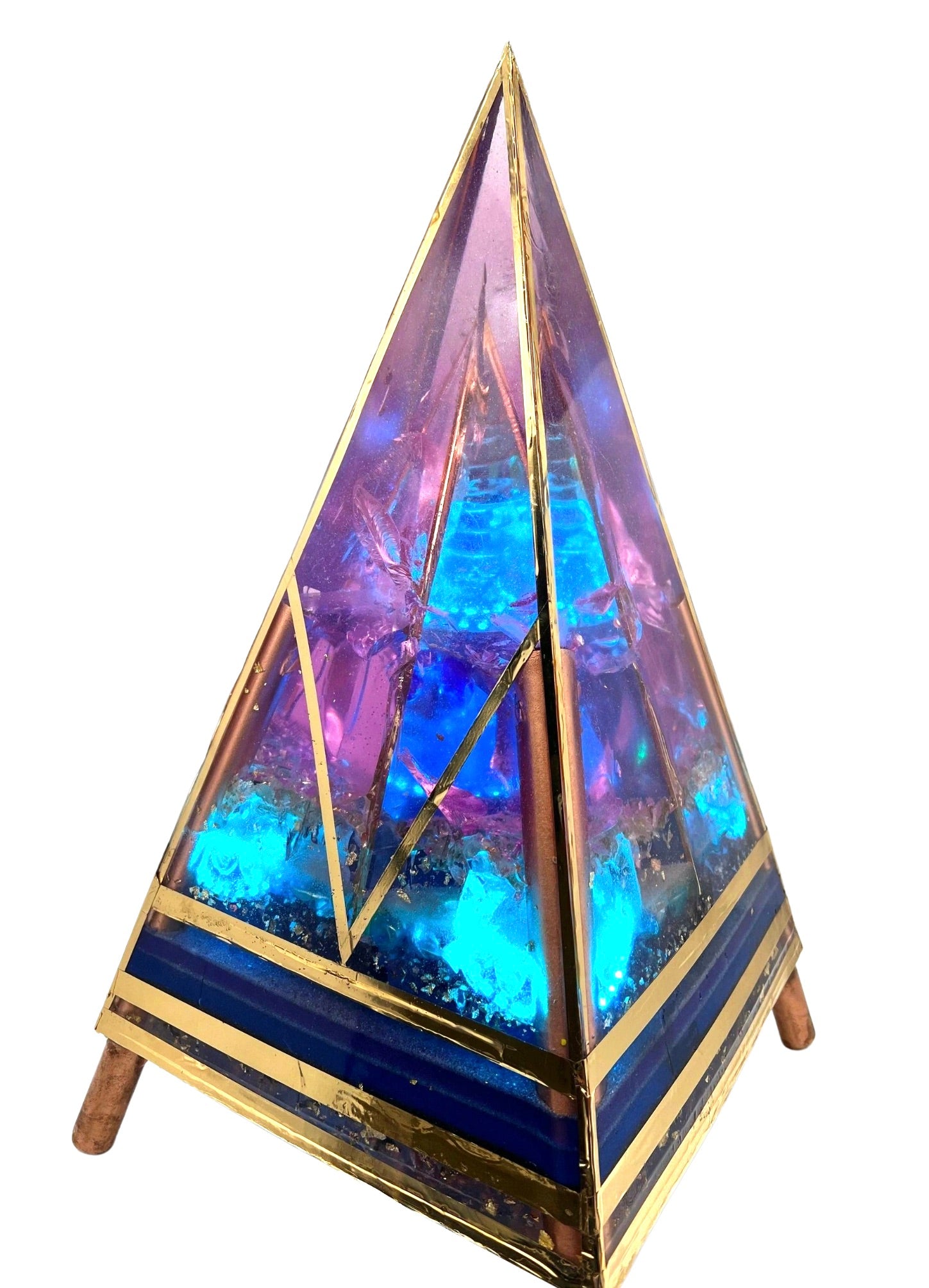 This Capstone is a "2 for 1" design as it literally consists of a Nubian Pyramid within another Nubian Pyramid. At its peak, you’ll find a 7 inch Double Terminated Brazilian Vogel wound in Copper Coil. The Crystal Vogel then connects to a 12-Sided Wire Wrapped Star Tetrahedron running clockwise and counterclockwise, which electrifies the properties of the Crystal. This generates a precision-like toroidal field, constantly elevating and cleansing the harmonic frequency of its location. This Plasma Core Generates its own Energetic Field similar to the Keshe Engine. The abundance of Plasma emitting from the device supports the body in healing itself.