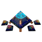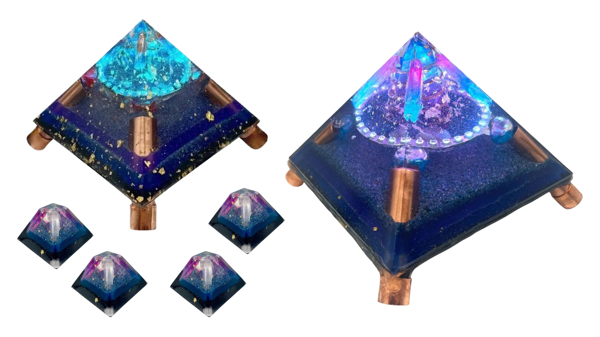 Each Pyramid is capped with a copper wrapped Brazilian-cut Quartz Crystal thus, amplifying the energy of the device with powerful precision. Every Bed Set is Light Encoded and one-of-a-kind. Intention with this device is highly encouraged as orgonite responds extremely well to co-creation. This will not only amplify its purpose, but will program the device to serve its user!