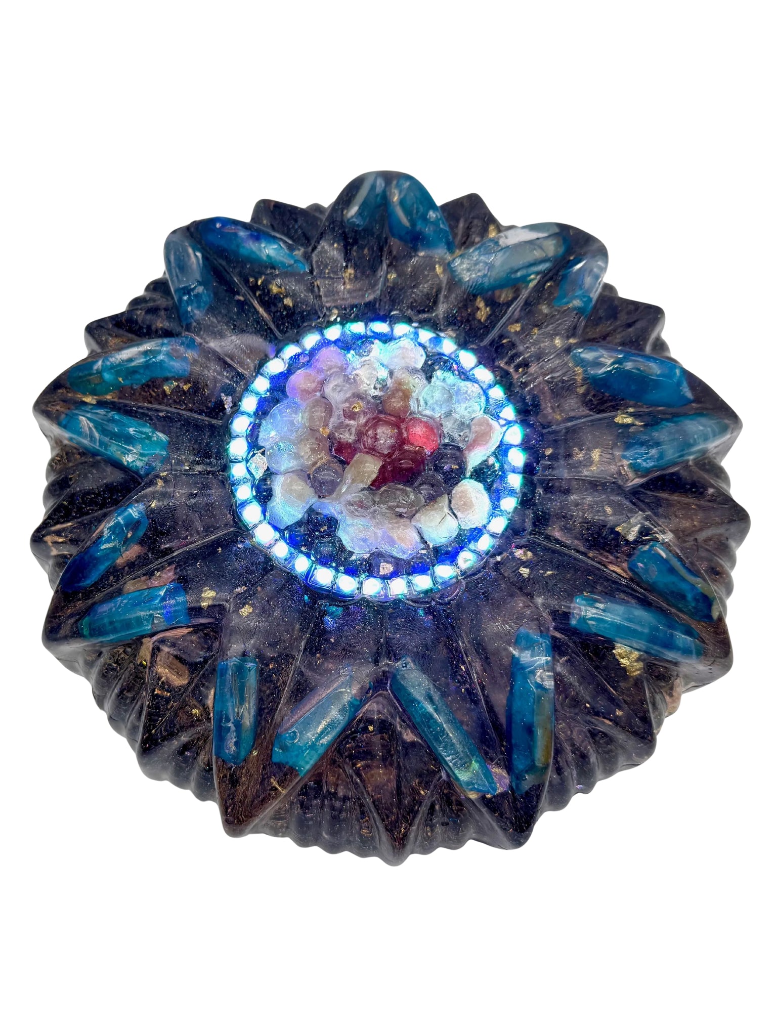 The Sundial Abundance Generator was inspired by an interest and desire to create a device with the right alchemy and power to accelerate abundance in all forms. After a year of development and intentional co-creation, we experienced marketable shifts and received corroborative feedback on just how supportive this generator can be. The toroidal field design allows for an interactive way of calling things/experiences to you. And including the Blue Azurite, made it a whole different ball game. As the Azurite clears and stimulates your Third Eye, so too do your visions enhance, thus maximizing your co-creation with the Alive Field.