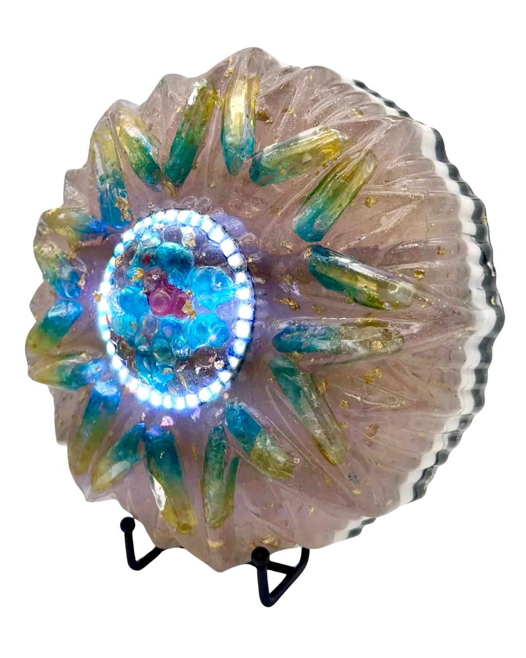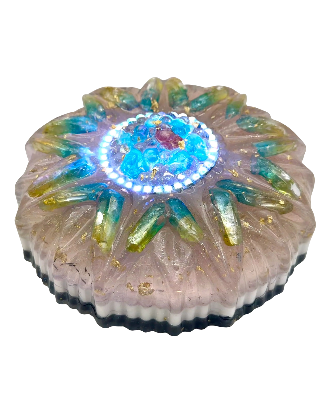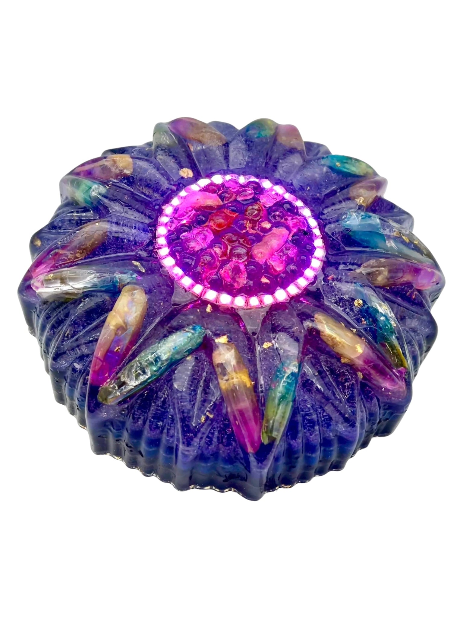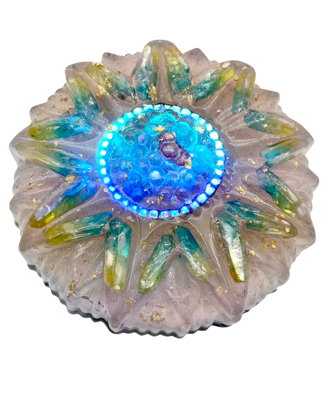 The Sundial Abundance Generator was inspired by an interest and desire to create a device with the right alchemy and power to accelerate abundance in all forms. After a year of development and intentional co-creation, we experienced marketable shifts and received corroborative feedback on just how supportive this generator can be. The toroidal field design allows for an interactive way of calling things/experiences to you. And including the Blue Azurite, made it a whole different ball game. As the Azurite clears and stimulates your Third Eye, so too do your visions enhance, thus maximizing your co-creation with the Alive Field.
