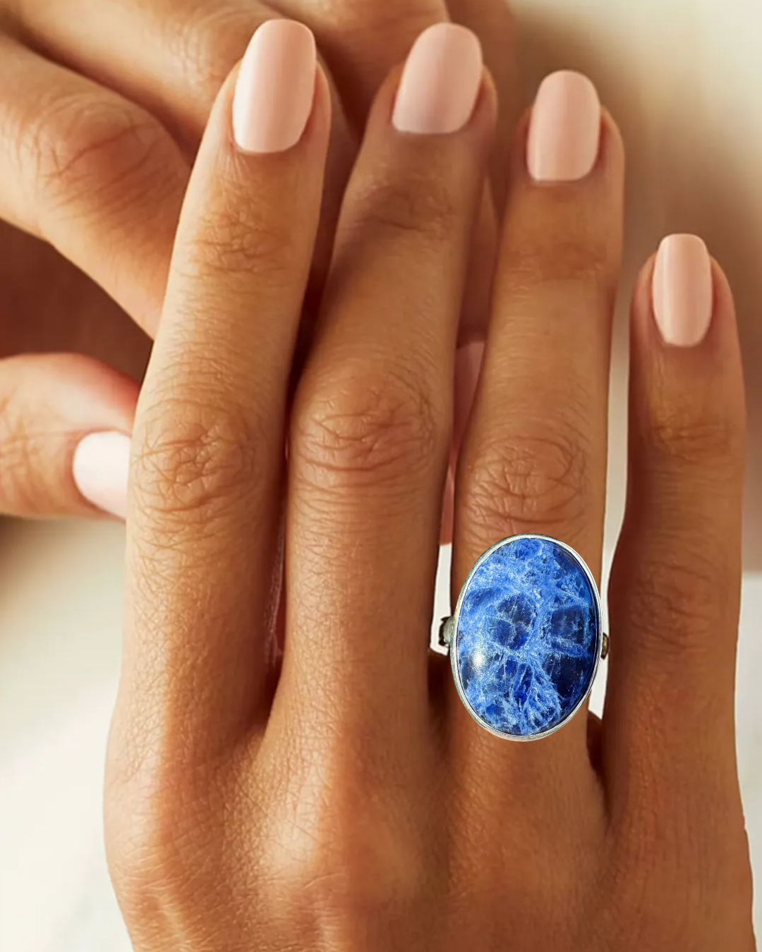 Ring with a blue stone on a clear crystal stand against a blurred background