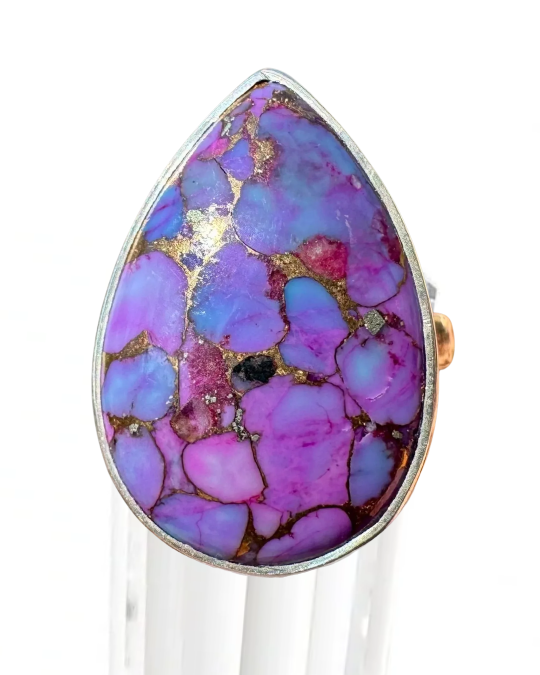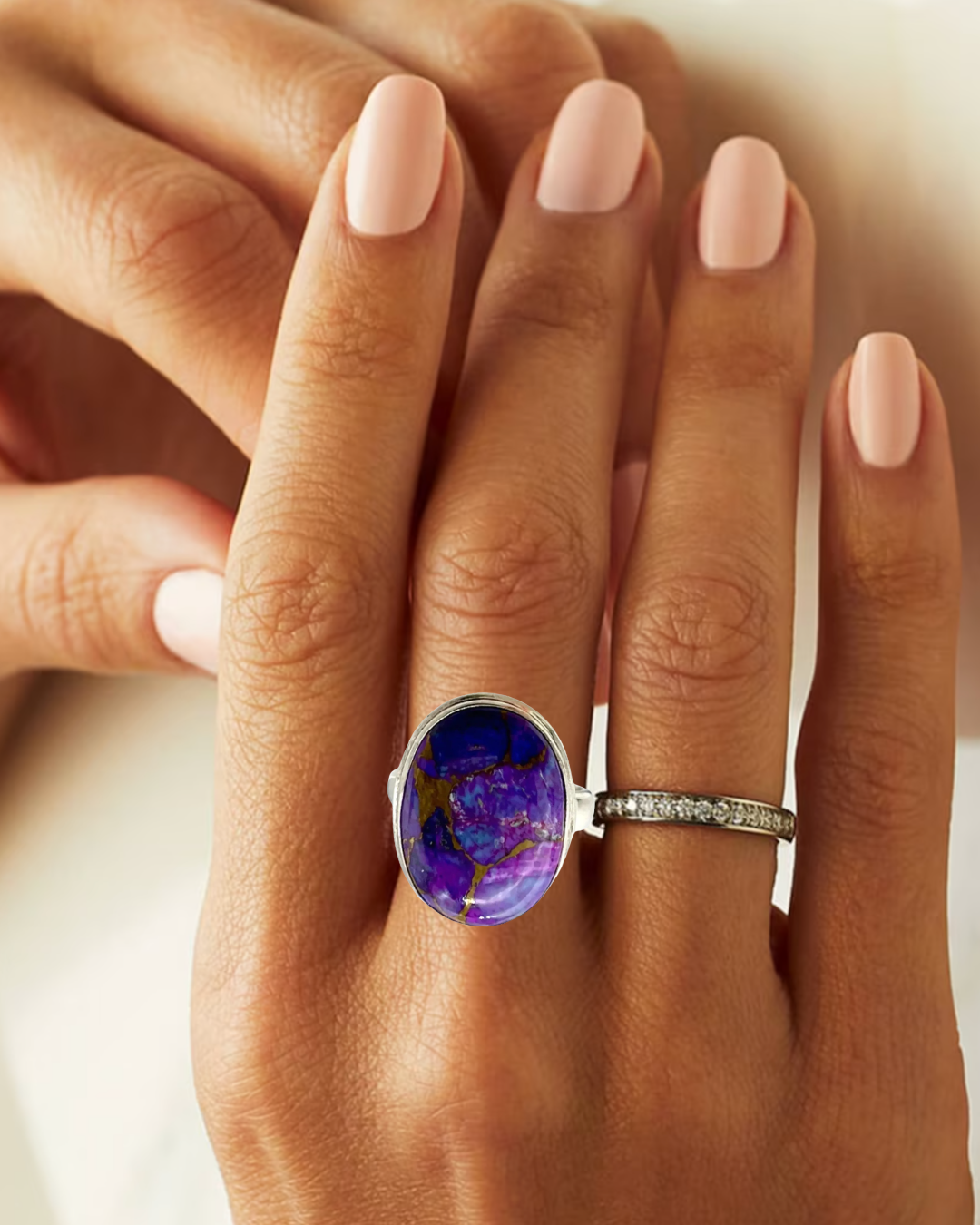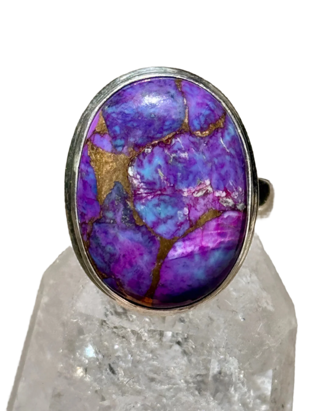 Metaphysically, Purple Copper Turquoise is said to combine the healing properties of both Turquoise and Copper, which includes promoting healthy communication, wisdom, and honesty. Often adorned by the Natives, it is believed to connect you with the Spirit world and psychic sensitivity. The melding of Turquoise and Copper offer an alchemy containing each of their unique properties. Copper is believed to represent honesty and forthrightness, balance the body's energy, promoting harmony and well-being.