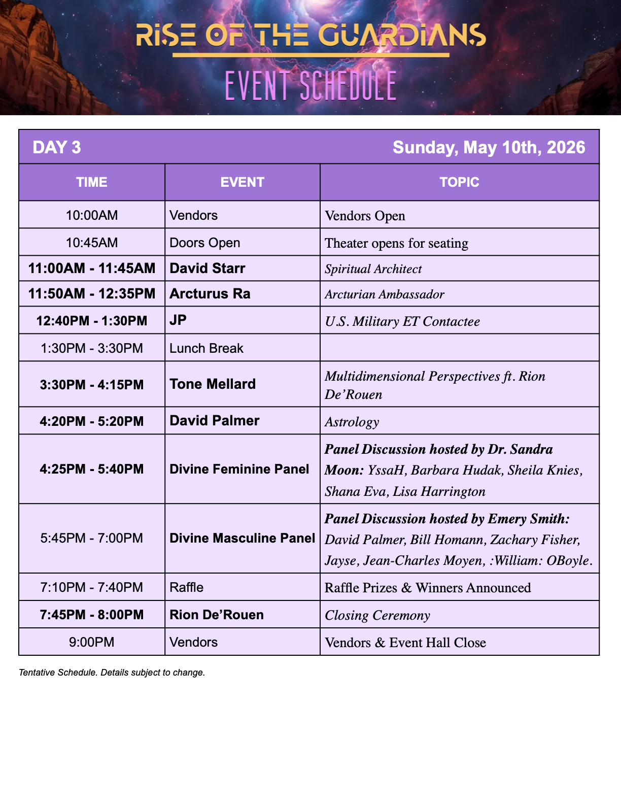 - Guardians Panel hosted by Jimmy Church - Featuring Rion De'Rouen, Tone Mellard, David Palmer, JP, and Tony Rodrigues.